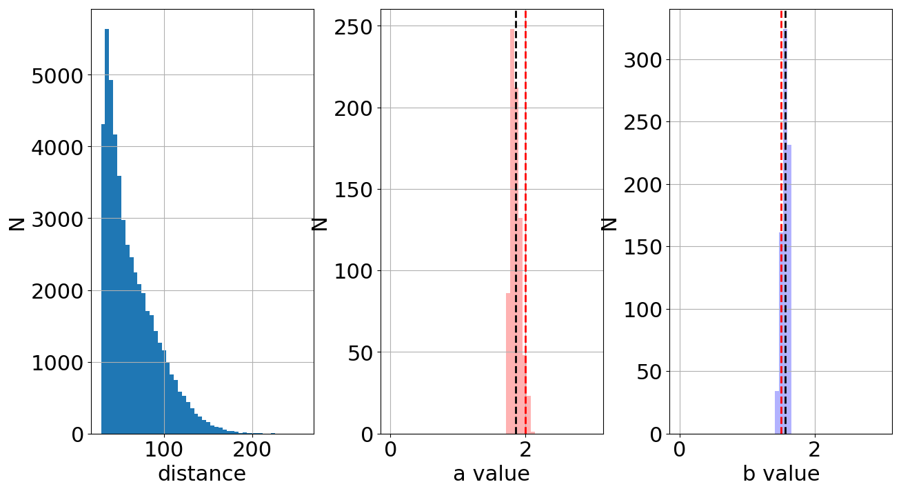 Now we generate the data, run the sampling and calculate the distance for each parameter set \(a\) and \(b\). In total, there are 50000 sets. Figure 2 shows the total distribution of distances (left), the "best" values of \(a\) (center) and the "best" values of \(b\) (right). Note that imposing low values of the variable \(threshold\), it only selects the closest/best models to reproduce the observed data.