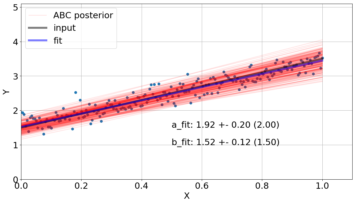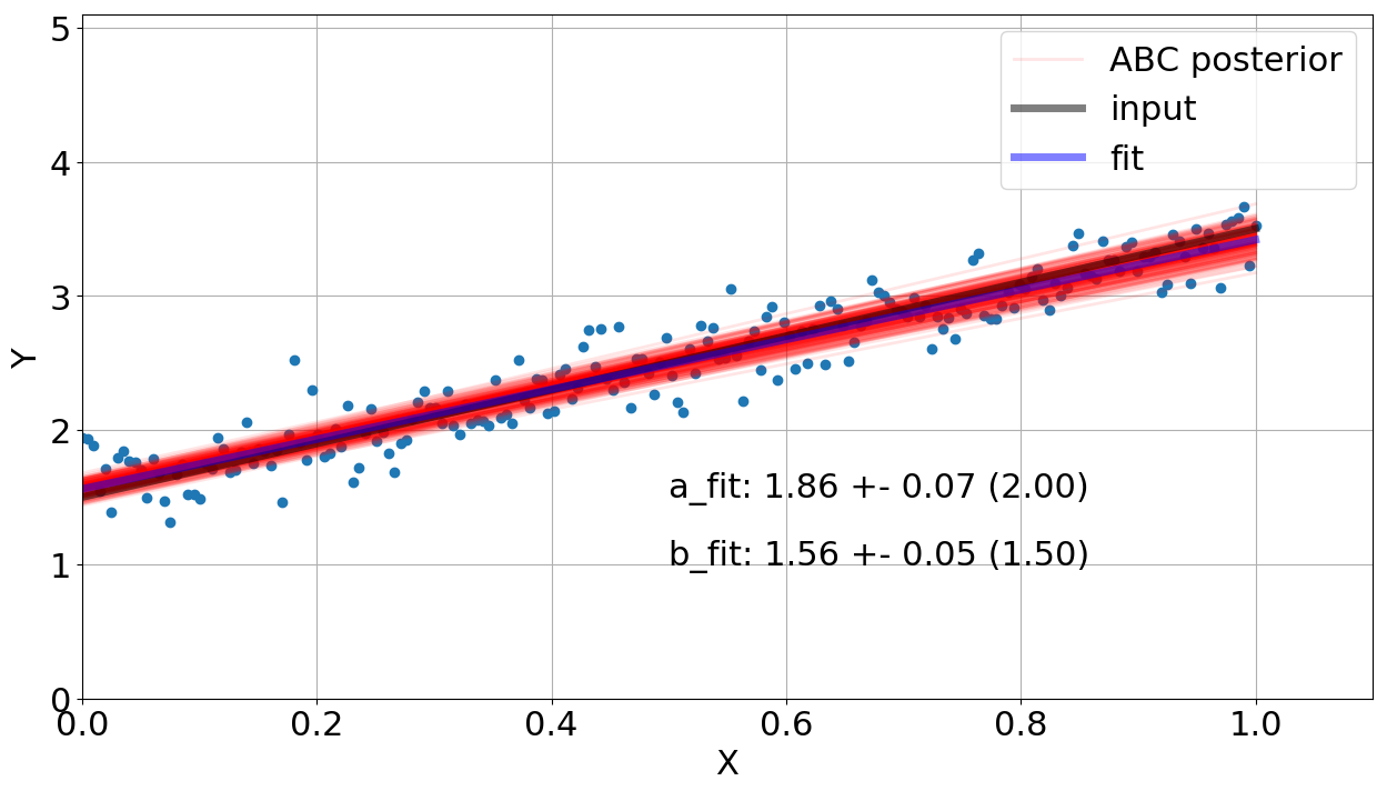 What is the best prior and threshold value? It is a good question and strongly depends on your problem. For this problem, the gaussian prior did not include the solution in 1 \(\sigma\) but presented lower dispersion. From this point of view, it seems that the gaussian choice did not sample properly the parameter space. Once using the uniform one, our solution is in agreement with the input parameters but the error bars for \(a\) and \(b\) are larger. Out of this scenario, if your likelihood is known and not computationally quite expensive to be calculated, I would not recommend you to use ABC. For instance, some \(\chi^2\) reduction-based method should be employed to fit your model to the data. This algorithm is only suggested when your likelihood is quite complicated or unknown. If you want the code of this post, just check my GitHub repository ABC. If you have any question or comment, just drop me an e-mail.