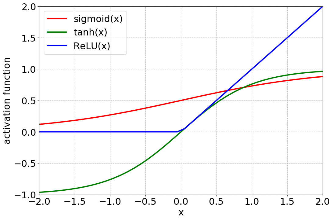 $$ z_1 = X * W_1 + b_1$$ being the dimensions of the weight and bias are equal to (\(n_{feature}, n_{hidden})\) and (\(n_{hidden}, 1)\), respectively. Note that the bias term \(b_1\) is just an additive term and the dimension of \(a_2\) is consequently (\(n_{obj}, n_{hidden})\). The powerful skill of ANNs is represented by their capacity of complex and non-linearity modelling. Just considering the matrix multiplication above is not enough to reach such complexity. The next step is to pass our multiplication matrix result through an activation function, which decides whether it should be considered (or not) as a good or bad result for the layer, given the necessary complexity to fit the model to the data. There are many activation functions around but the main and most famous activation function is the sigmoid. Figure 2 shows the profile of the sigmoid(x) and others functions, such as tanh(x) and REctified Linear Unit aka ReLU(x).